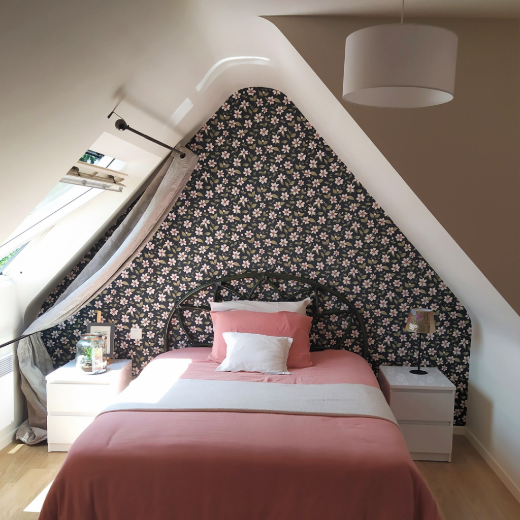 L’espace sommeil est mis en valeur par le papier peint « clématites ». Son fond bleu encre donne de la profondeur à la pièce souvent ouverte vue du couloir.